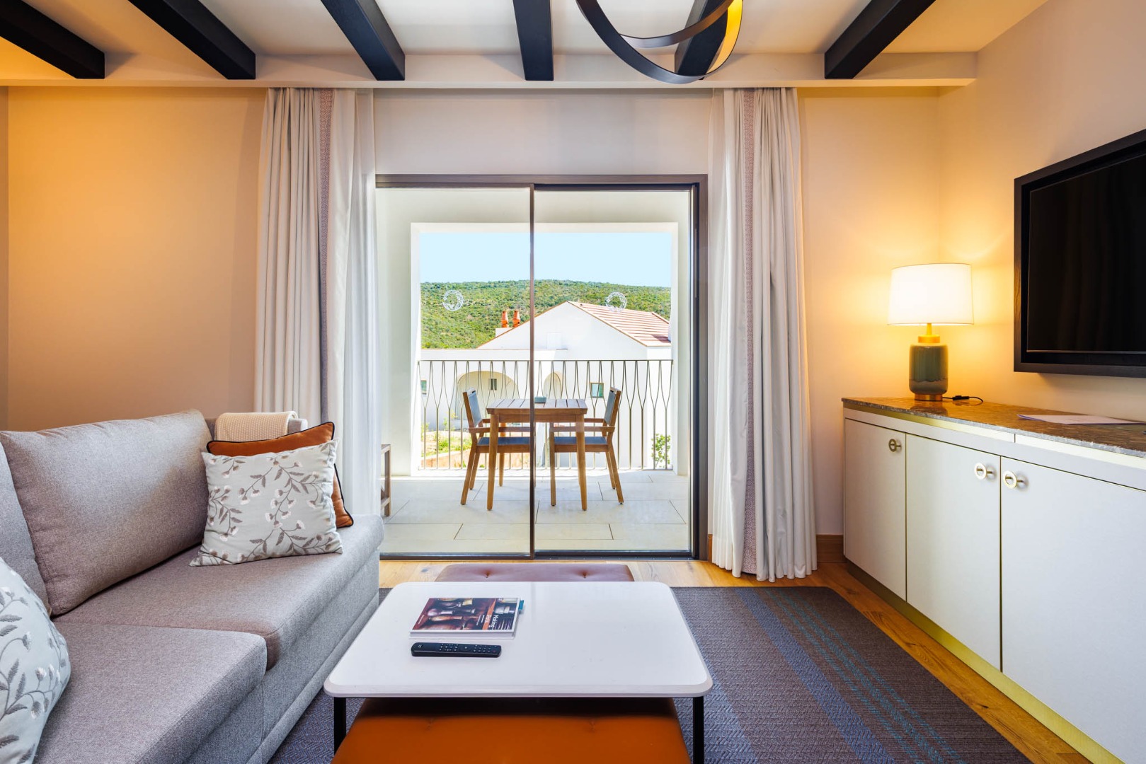 This elegant one-bedroom suite, located on a top floor, offers a refined retreat with thoughtfully designed interiors and a fluid connection between indoor and outdoor living. The open-plan kitchen and living area is both stylish and inviting, extending onto a covered terrace with partial golf views that lends itself to relaxed alfresco dining.